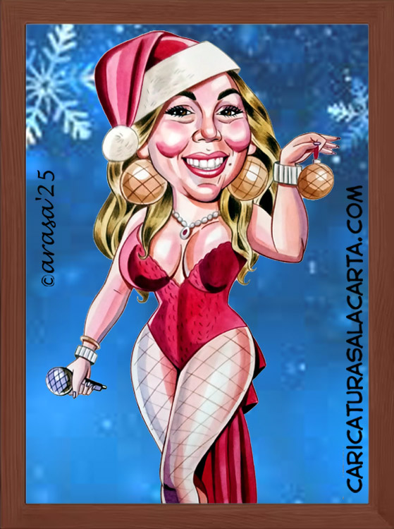 Caricatura de la famosa cantante Mariah Carey pintada con acuarela y lápiz de color. Mariah vuelve cada Navidad con su “All i want for Christmas is you”.